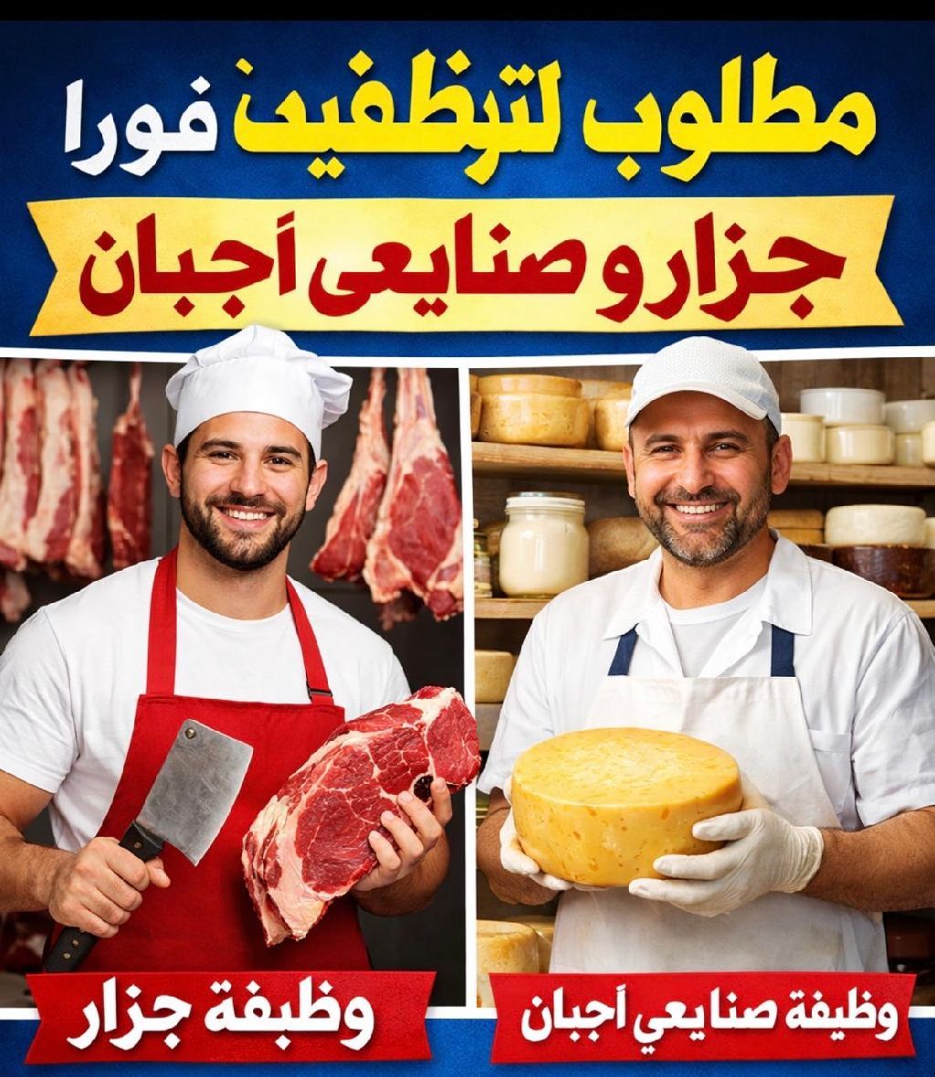 مطلوب للعمل فورا بعد التجربة صنايعي أجبان لديه خبرة في ثلاجة الأجبان وترتيب البضاعة في السوبر ماركت مطلوب أيضا جزار لديه خبرة في البيع فيزا سياحة أو اقامة قابلة للإعارة ممنوع الاتصال ابعت ع الواتساب سي في أو بيانات عنك وما يثبت انك اشتغلت في المجال وسيتم التواصل معكم صفر 555 سبعه 6 خمسه تسعه 6