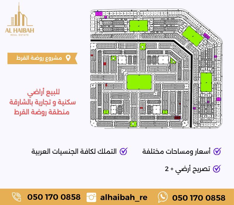للبيع أراضي سكنية وتجارية في الشارقة منطقة روضة القرط تصريح أرضي، 2 الأراضي السكنية مساحات تبدأ من 3100 قدم موقع مميز يقع على طريق خور فكان الجديد في إمارة الشارقة ومقابل منطقة السيوح بالقرب من دبي وشارع الامارات العابر وطريق الذيد وطريق مليحة ويبعد عن مطار الشارقة الدولي 10 دقائق ومطار دبي الدولي 20 دقيقة