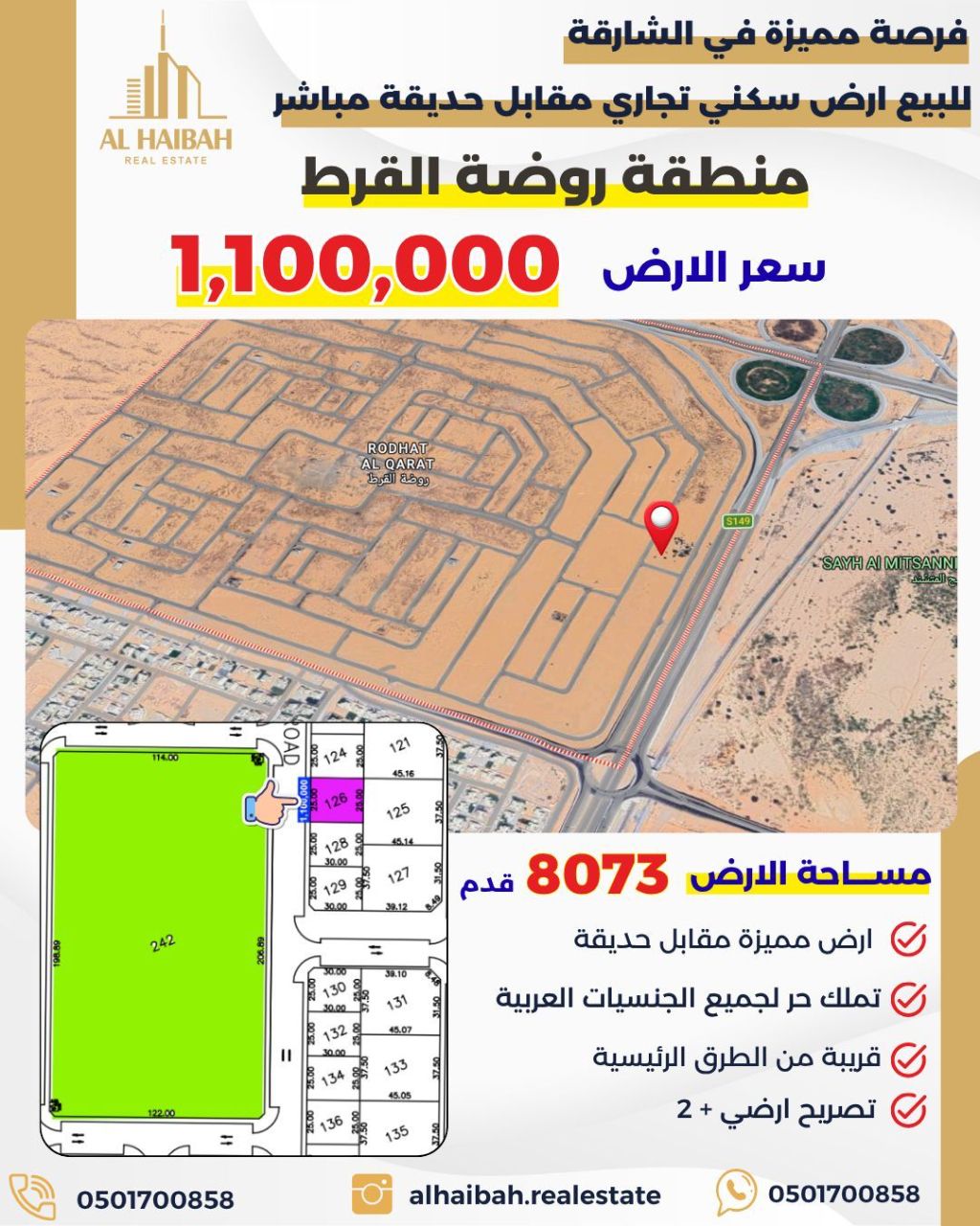 للبيع أرضي سكني تجاري في الشارقة منطقة روضة القرط مساحة الأرض 8073 قدم موقع مميز على شارع 24 متر وقريب الحديقة تصريح أرضي محلات طابقين سكني مسموح بتسجيل وافد عربي السعر المطلوب 110000 درهم كما يوجد أراضي سكنية وتجارية مساحات وأسعار مختلفة أيضا