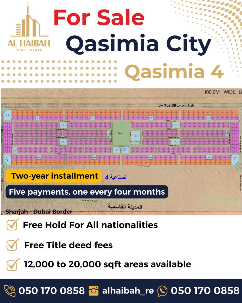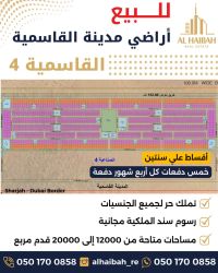 للبيع أراضي صناعية في الشارقة المدينة القاسمية تكملة اقساط أسعار وأحجام مختلفة تملك حر لجميع الجنسيات، بدون رسوم تسجيل متوفر في جميع المراحل