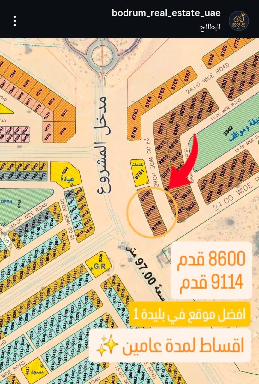 للبيع أرض في البليدة 1 - الشارقة الموقع على شارعين، شارع عام أمامي بعرض 97 متر وشارع خلفي بعرض 24 متر المساحة 8632 قدم مربع سعر القدم 175 درهم السعر الاجمالي 1510600 درهم نظام السداد الدفعة الأولى (للمالك) 845936 درهم بشيك منجر المتبقي على 7 اقساط كالتالي 94952 درهم - 94952 درهم - 94952 درهم - 94952 درهم - 94952 درهم - 94952