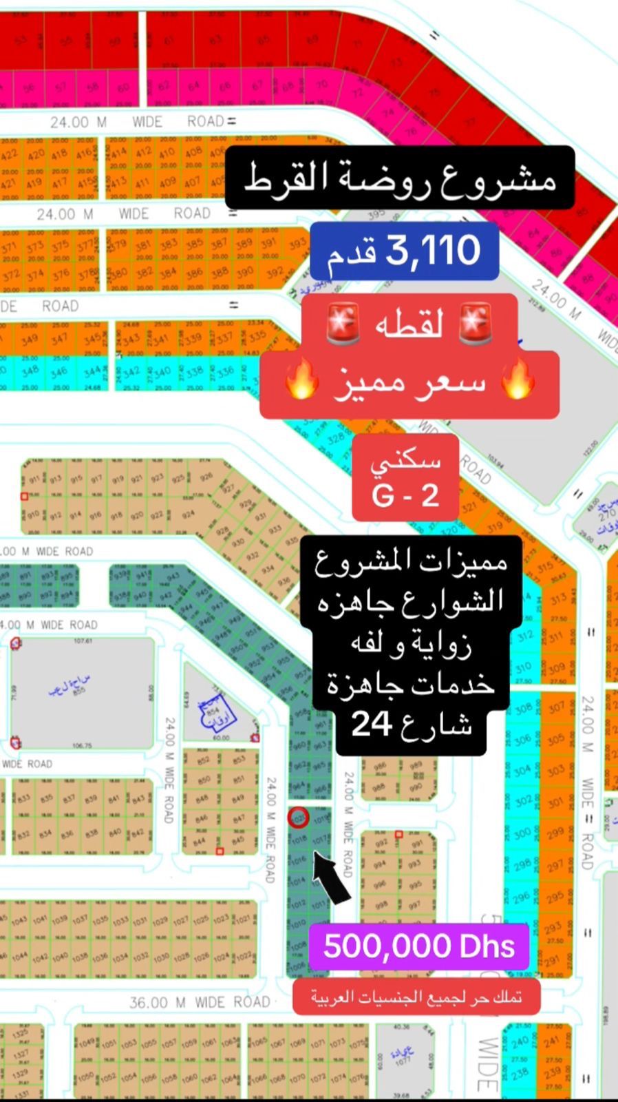 للبيع أرض سكنية - مشروع روضة القرط (2 - G المساحة 3110 قدم مربع السعر المطلوب 500000 درهم لقطة بسعر مميز جدا مميزات المشروع الشوارع جاهزة بالكامل - موقع زاوية ولفة مميز - تتوفر كل الخدمات - شارع بعرض 24 متر - تملك حر لجميع الجنسيات العربية موقع استراتيجي وفرصة ممتازة لبناء منزل العمر في مشروع راق ومتطور بروضة القرط