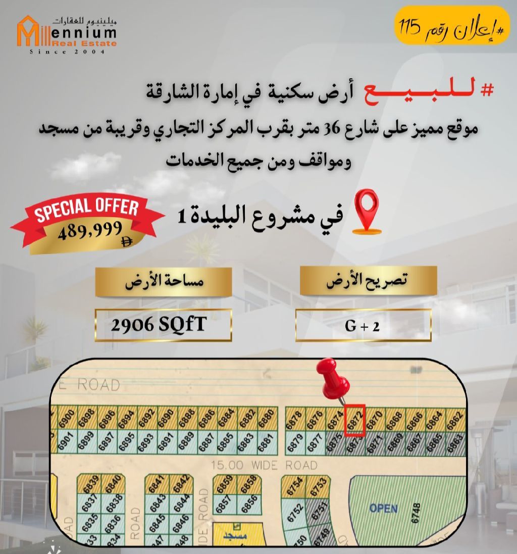 فرصة استثمارية ذهبية أرض سكنية للبيع في الشارقة، في مشروع البليدة 1 موقع مميز على شارع 36 متر بقرب المركز التجاري وقريبة من مسجد ومواقف ومن جميع الخدمات مساحة الأرض 2906 قدم مربع سعر مغري 489999 درهم اماراتي تملك حر لجميع الجنسيات العربية ما عليك سوى التواصل معنا وسنزودك بجميع التفاصيل عبر رقم الهاتف أو البريد الألكتروني
