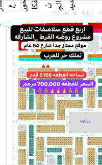 للبيع أربع أراضي متلاصقات في مشروع روضة القرط في إمارة الشارقة بمساحة 5166 قدم بموقع مميز على شارع 54 العام بالقرب من الحديقة والمسجد بتصريح أرضي وطابقين وتملك حر للعرب بسعر 700000 درهم