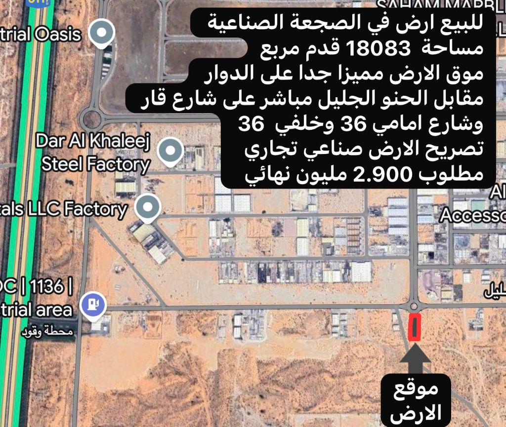 فرصة استثمارية مميزة - أرض صناعية للبيع في الصبغة الصناعية للبيع أرض بمساحة 18083 قدم مربع في موقع استراتيجي للغاية على الدوار مباشرة، مقابل الحينوا الجليل وبواجهة على شارع قار 36 من الأمام والخلف، مما يجعلها خيارا مثاليا لمختلف الأنشطة الصناعية والتجارية. مميزات الموقع موقع ممتاز على الدوار شارع أمامي 36 وخلفي 36 مقابل الحينوا الجليل مباشرة قريبة من المصانع والخدمات الرئيسية التصريح أرض صناعي - تجاري