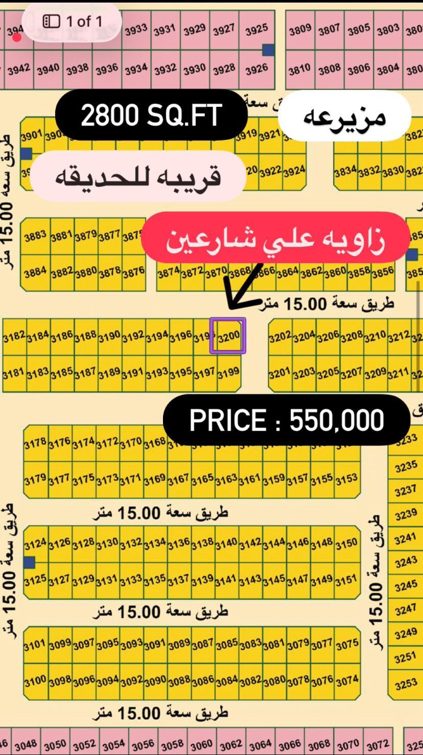 للبيع أرض زاوية علي شارعين مقابل الحديقة في مزيرعة مساحتها 2800 قدم بسعر لقطة 550 ألف درهم نهائي