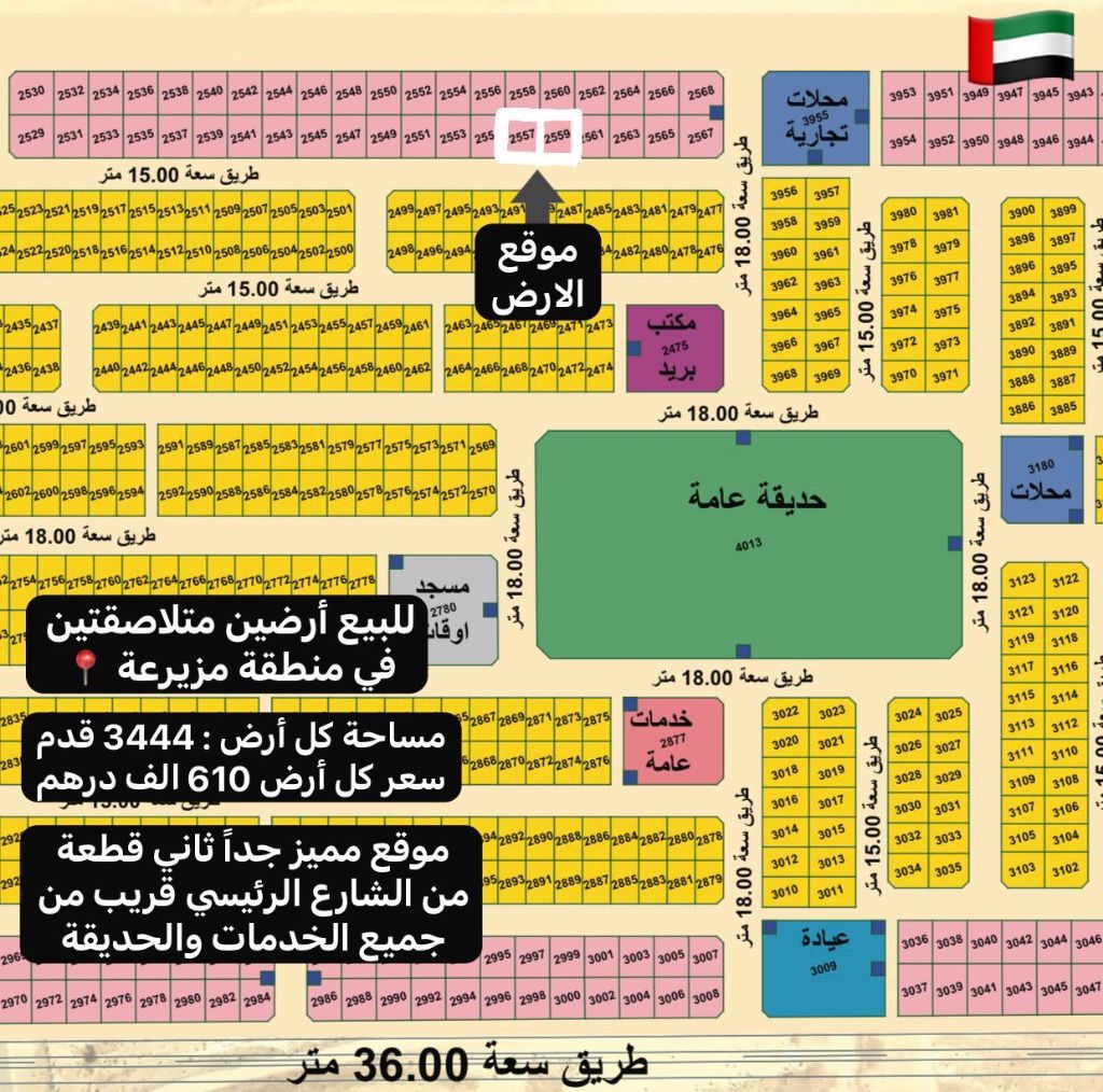 للبيع أرضين متلاصقتين في منطقة مزيرعة مساحة كل أرض 3444 قدم مربع السعر المطلوب لكل أرض 610 ألف درهم موقع مميز جدا ثاني قطعة من الشارع الرئيسي قريب من جميع الخدمات والحديقة