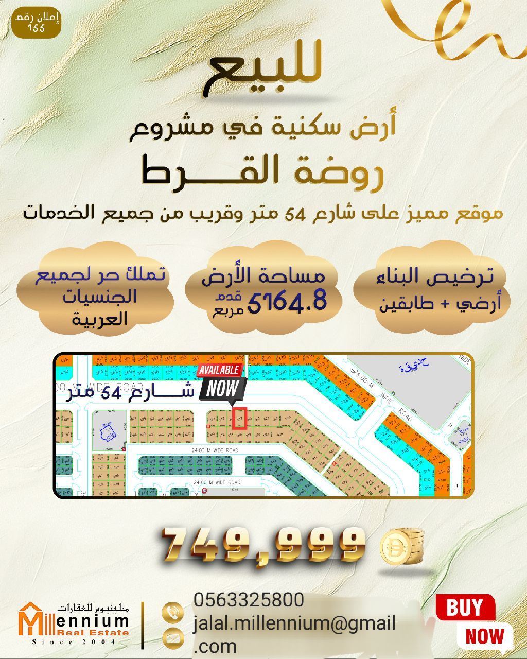 فرصة استثمارية ذهبية أرض سكنية للبيع في الشارقة، في مشروع روضة القرط موقع مميز على شارع 54 متر وقريب من جميع الخدمات مساحة الأرض 5164.8 قدم مربع سعر مغري 749999 درهم اماراتي تملك حر لجميع الجنسيات العربية ترخيص البناء أرضي + طابقين ما عليك سوى التواصل معنا وسنزودك بجميع التفاصيل عبر رقم الهاتف أو البريد الألكتروني