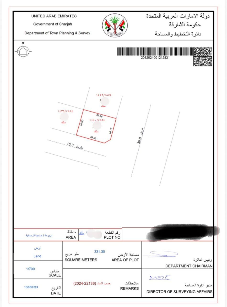 قطعة أرض للبيع مميزة / مزيرعة على زاوية شارعين رئيسي وجار 331.30 متر مربع مطلوب 720000 المشير للعقارات الشارقة - الشرق - خلف المستشفى السعودي الألماني