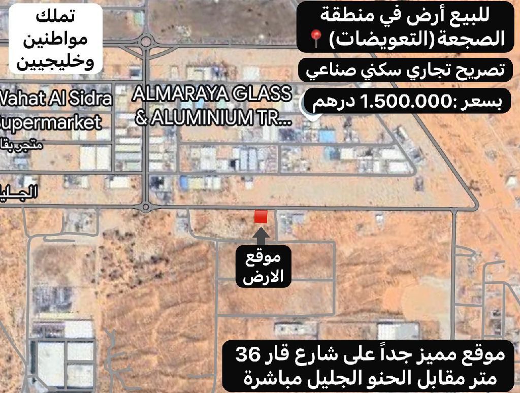 فرصة استثمارية مميزة للبيع أرض في منطقة الصجعة (التعويضات) المساحة 9040 قدم مميزات الأرض تصريح تجاري + سكني + صناعي - موقع مميز واستراتيجي - جاهزه للبناء - مناسبة للاستثمار العقاري - منطقة استثمارية بامتياز السعر 1.500M درهم شركة دار المستقبل العقارية