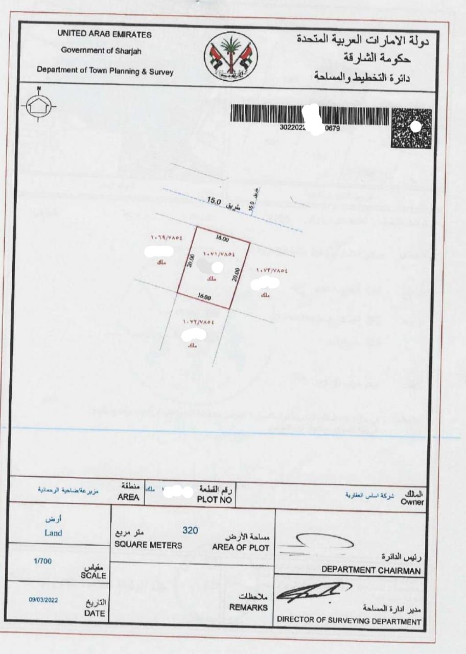 للبيع أرض سكني استثماري تصريح بناء فيلا تتكون من دور أرضي + طابقين في إمارة الشارقة منطقة مزيرعة خلف الهلال الأحمر موقع متميز جدا على شارع جار بجانب الأرض يوجد بناء المنطقة فيها جميع الخدمات والنية التحتية مكتمله الأراضي جاهزه للبناء تملك حر لجميع الأخوه العرب الأرض تقع على شارع عرض 15 متر الأرض مساحة الأرض 320 متر مربع مساحة الأرض 3444 قدم ملاحظة يوجد أكثر من قطعة متلاصقة