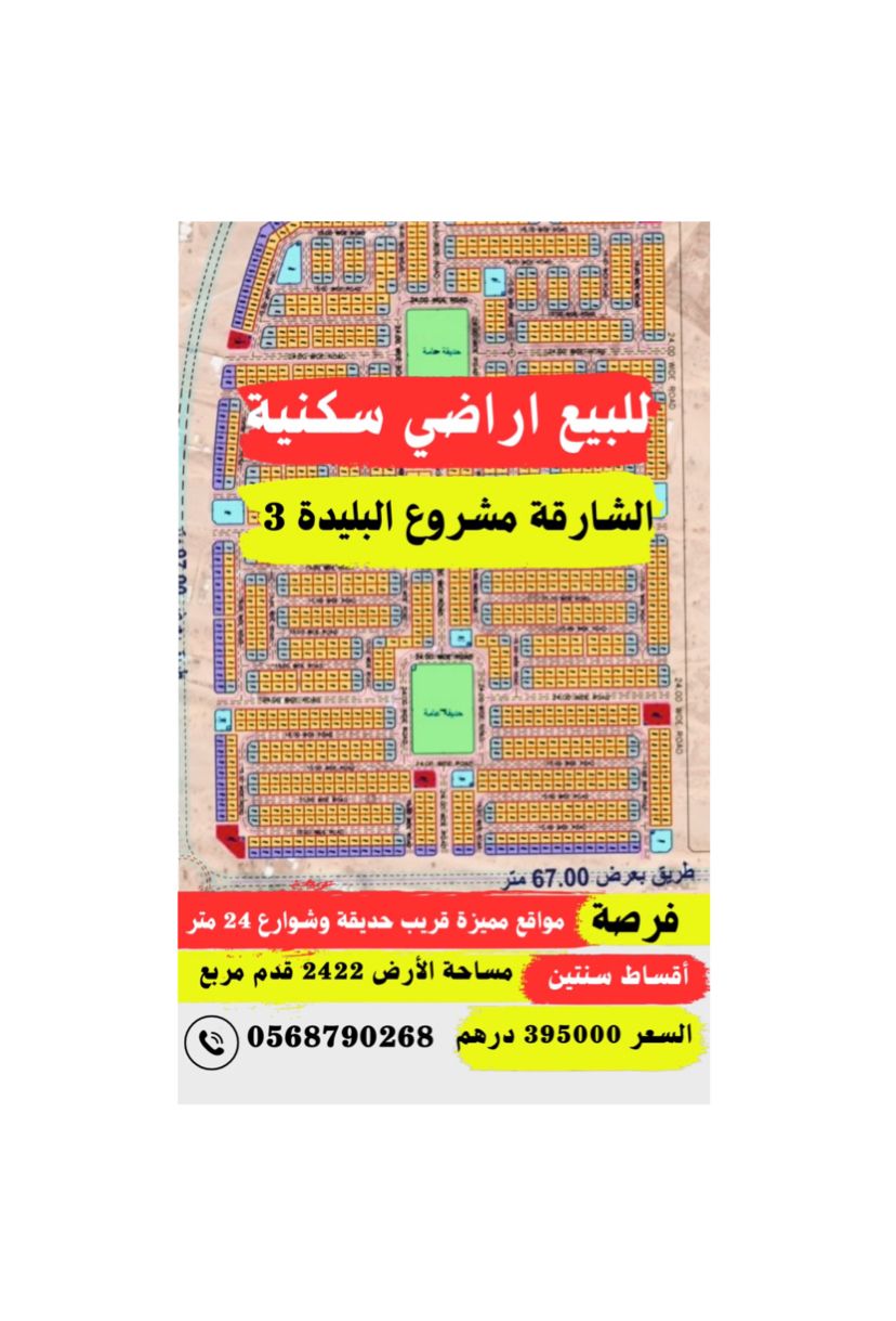 للبيع أراضي سكنية في الشارقة مشروع البليدة 3 مساحة 2422 قدم مربع مواقع مميزة قريب الحديقة شوارع 24 متر تصريح بناء فيلا دور أرضي + دور أول + دور ثاني مسموح تملك حر لجميع الجنسيات العربية سعر القطعة الاجمالي 395000 درهم أول دفعة نقدا 123736 درهم والمتبقي اقساط على سنتين كل 6 شهور دفعة 67816 درهم تواريخهم 12072026 12012027 12072027 12012028 للتواصل