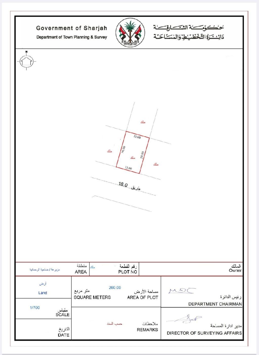 للبيع أرض سكنية في إمارة الشارقة منطقة مزيرعة / ضاحية الرحمانية / المرحلة الثانية تصريح بناء الأرضسكني استثماري أرضي + طابقين موقع الأرض متميز جدا لقربها من الحديقة ومدخل ومخرج من الموقع سهل جدا مساحة الأرض 260 متر مربع مساحة الأرض 2800 قدم مربع الأرض سعرها جدا ممتاز وأقل سعر بالسوق البيع كاش لا يوجد فيها اقساط المنطقة راقية جدا قريبة من الرحمانية ومطار الشارقة الدولي قريبة جدا من دبي وعجمان