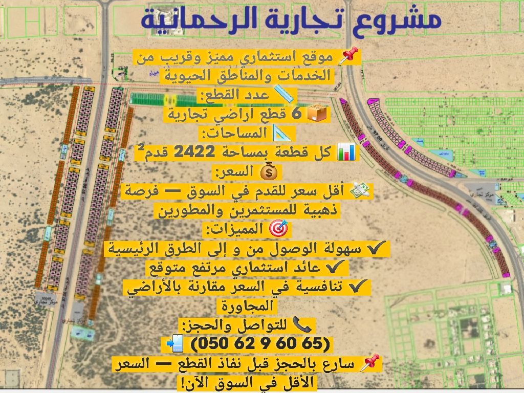 منطقة الرحمانية - موقع استثماري مميز وقريب من الخدمات والمناطق الحيوية عدد القطع 6 قطع أراضي تجارية المساحات كل قطعة بمساحة 2422 قدم السعر أقل سعر للقدم في السوق فرصة ذهبية للمستثمرين والمطورين المميزات موقع استراتيجي تجاري مناسب للبناء التجاري، محلات، مبنى اداري، أو استثمار طويل الاجل سهولة الوصول من والى الطرق الرئيسية عائد استثماري مرتفع متوقع تنا