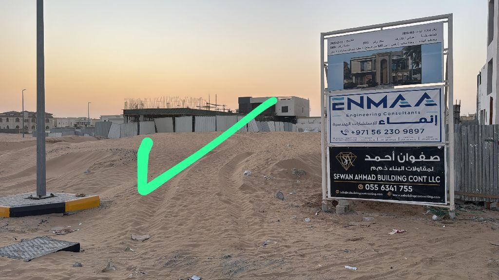 للبيع قطعة أرض في الشارقة منطقة الحوشي بسعر مناسب تصريح فلل أرضي أول ورووف تملك عرب مساحة 502م تبعد 5 دقائق عن مطار الشارقة و9 دقائق عن مطار دبي خلف قصور البديع المخطط به حديقة ومسجد