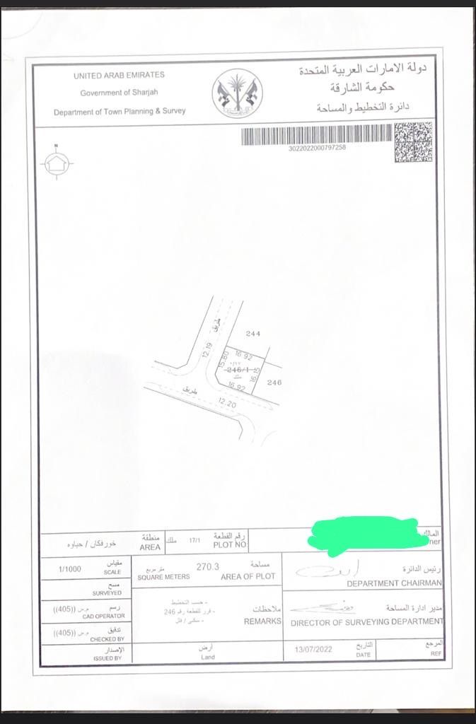 للبيع في خور فكان أرض سكنيه استثماريه منطقة حياوة تصريح أرضي + 2 + رووف زاوية على شارعين المساحة 270 متر مربع مطلوب 520 ألف درهم