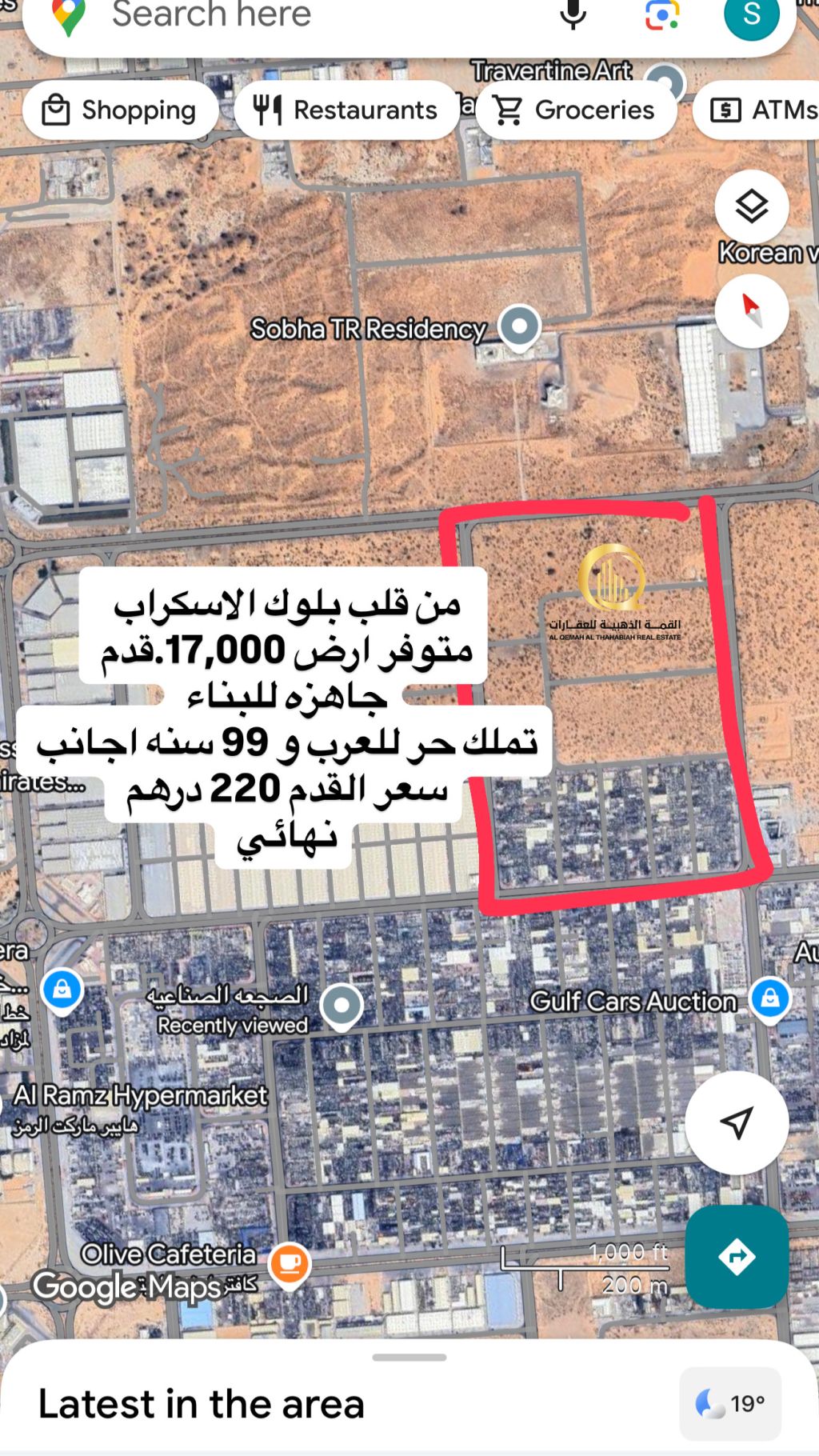 للبيع قطعة أرض في مدينة الإمارات الصناعية الصجعة الصناعية موقع ممتاز جدا في قلب السكراب مساحة 17070 قدم ثاني قطعة من الشارع العام سهله الدخول والخروج من الامارات العابر تملك حر للعرب و99 سنة أجانب السعر حصري 220 درهم للقدم السعر الاجمالي 3740000 درهم