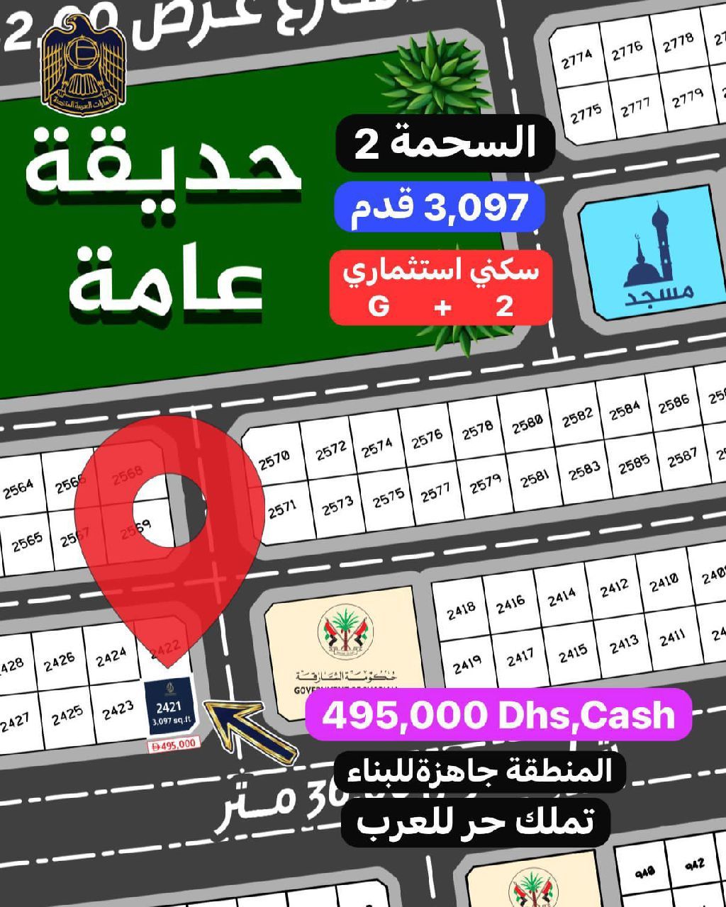 للبيع قطعة أرض زاوية سكني بمنطقة السحمة 2 ضاحية الرويضات في الشارقة المساحة الأرض 3097 قدم تصريح سكني أرضي وطابقين G 2 موقع استراتيجي مميز جدا زاوية مقابل خدمات عامة وقريبة جدا من الحديقة والمسجد وقريبة من شارع خور فكان وشارع الامارات العابر وقريب من منطقة السيوح تملك حر لجميع الجنسيات العربية مطلوب 495000 درهم
