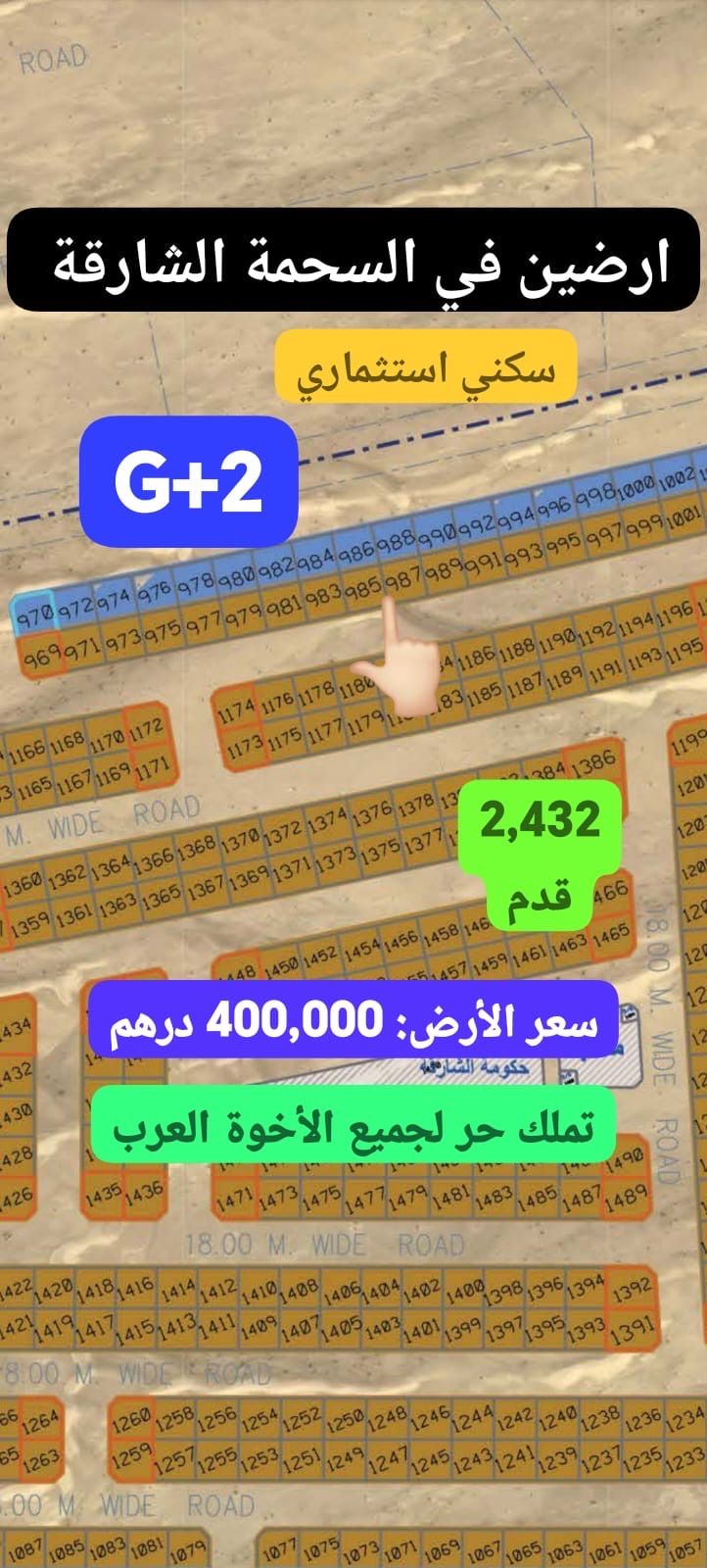 للبيع أرضين في السحمة بمساحة 2432 قدم موقع مميز قريب من الشارع العام تملك حر لجميع الجنسيات العربية تصريح بماء أرضي وطابقين سعر الأرض 400000 درهم