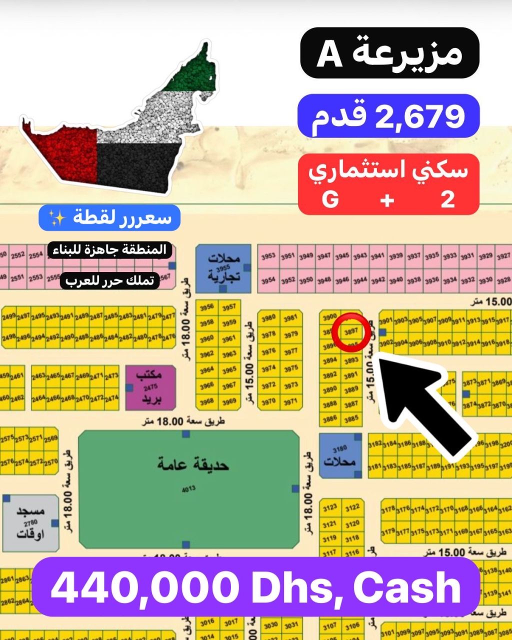 للبيع أرض في مزيرعة A مساحة الأرض 2679 قدم موقع الأرض مميز جدا ثاني قطعة من الزاوية قريب من الحديقة العامة والمحلات التجاريه السعر لقطة 440 ألف درهم