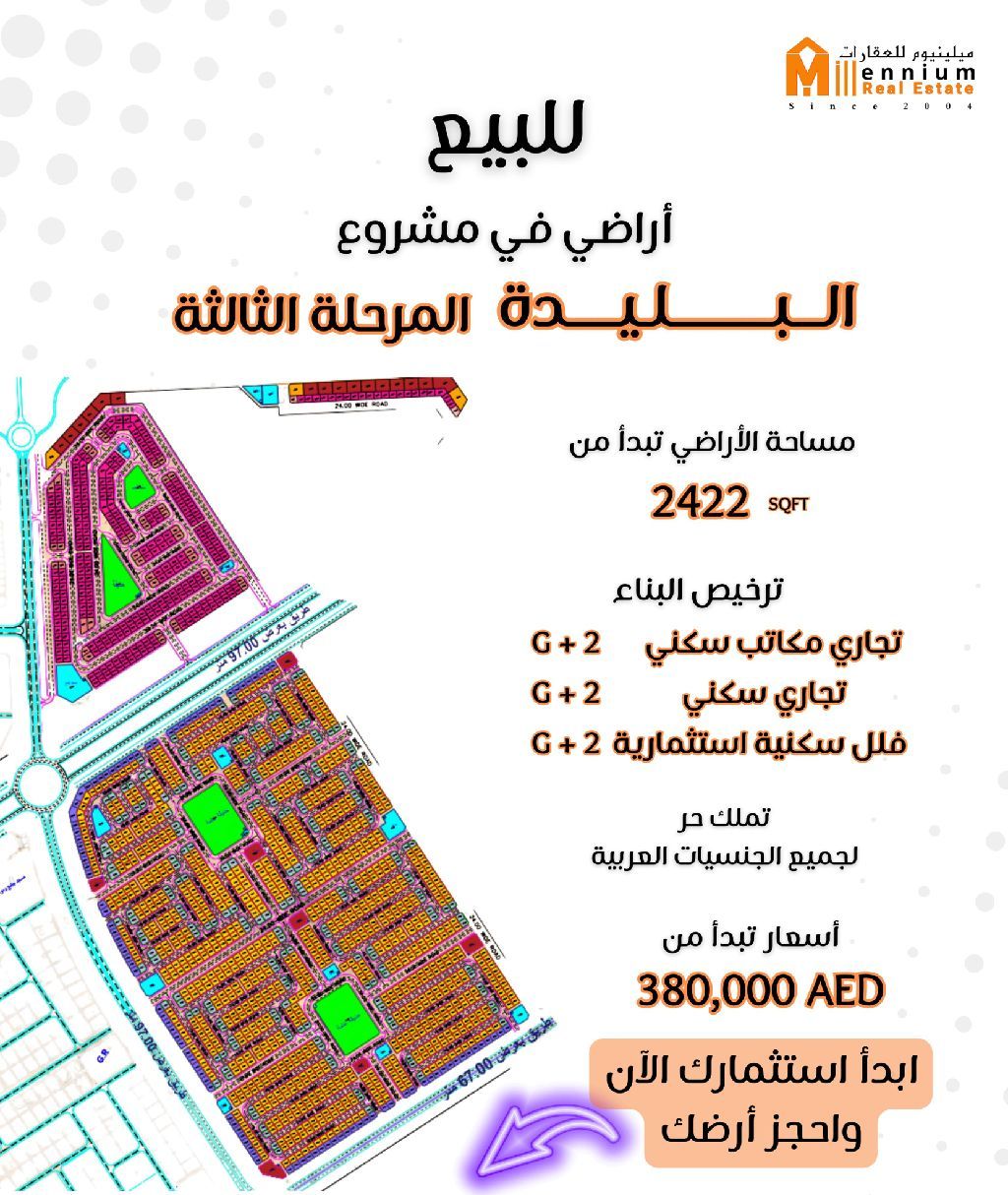 أراضي للاستثمار في مشروع البليدة المرحلة الثالثة تتوفر أراضي سكنية، تجارية للبيع وبأسعار تنافسية للاستفسار يرجى الاتصال
