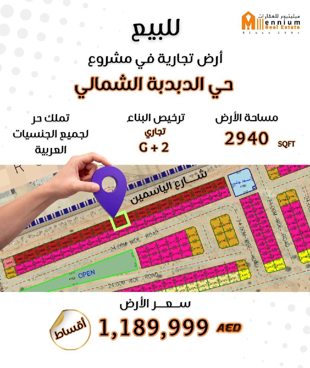 أرض تجارية للبيع في الشارقة، في مشروع حي الدبدبة الشمالي موقع مميز على شارع الياسمين مباشرة مساحة الأرض 2940 قدم مربع سعر الأرض 1189999 درهم اماراتي تملك حر لجميع الجنسيات العربية تصريح تجاري أرضي + 2 متوفر اقساط ما عليك سوى التواصل معنا وسنزودك بجميع التفاصيل عبر رقم