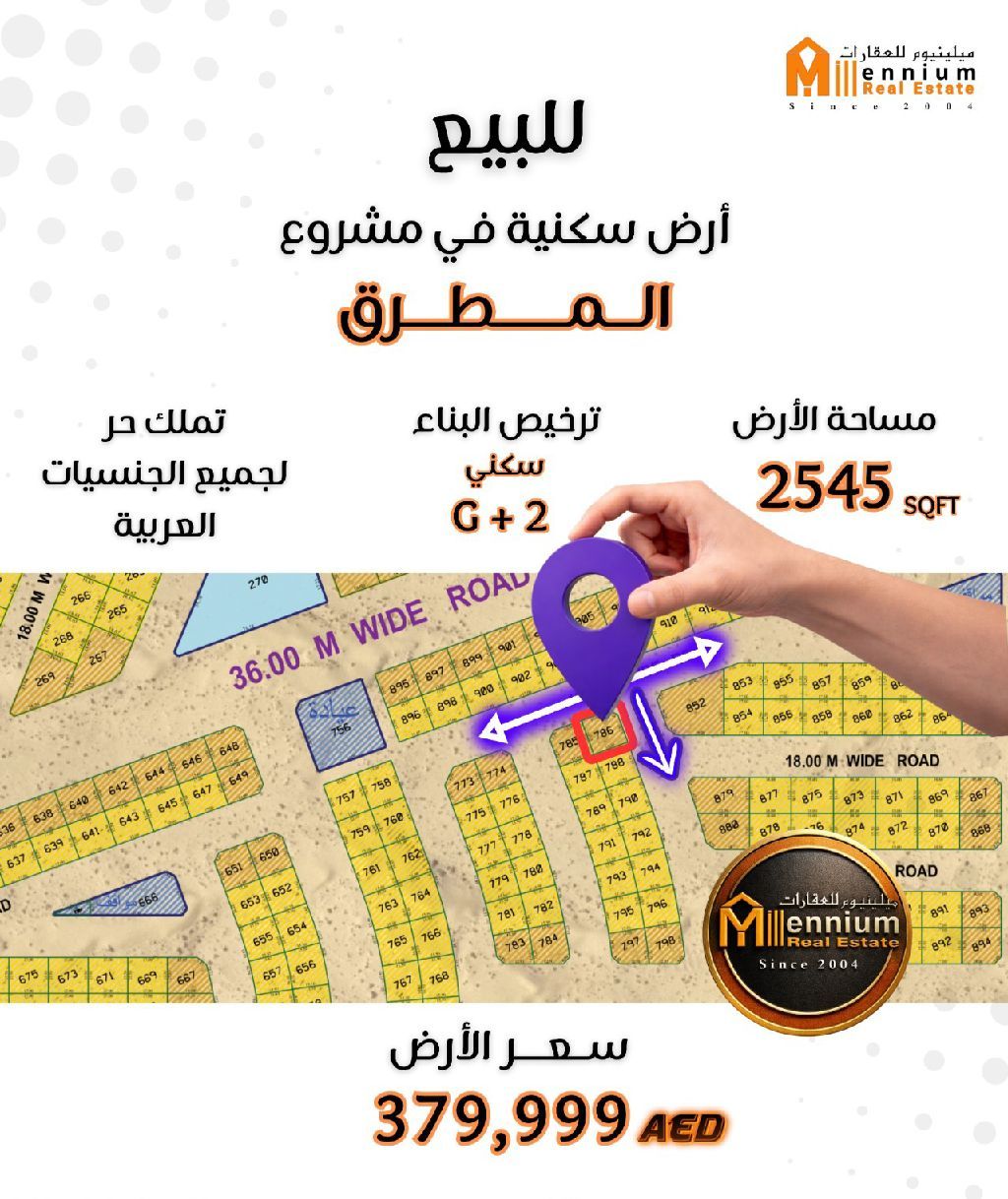 أرض سكنية للبيع في الشارقة، في مشروع المطرق موقع مميز زاوية على 3 شوارع مساحة الأرض 2545 قدم مربع سعر الأرض الواحدة 379999 درهم اماراتي تملك حر لجميع الجنسيات العربية تصريح سكني أرضي + 2 ما عليك سوى التواصل معنا وسنزودك بجميع التفاصيل عبر رقم