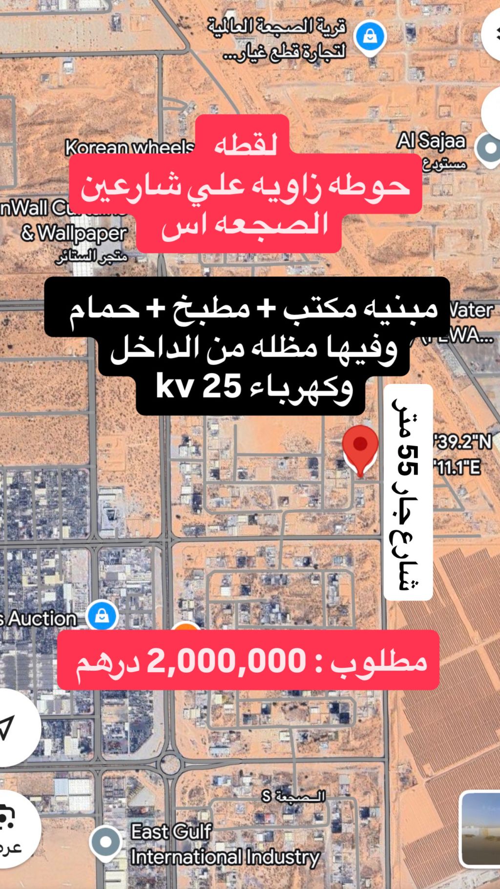 لقطة للبيع في الصجعة الصناعية منطقة الصجعة أس أرض زاوية شارعين 24م مبنيه مساحة 10000 قدم مكتب + مطبخ + حمام خلف الحوطة شارع جار 55 متر موقع ممتاز مطلوب 2 مليون درهم