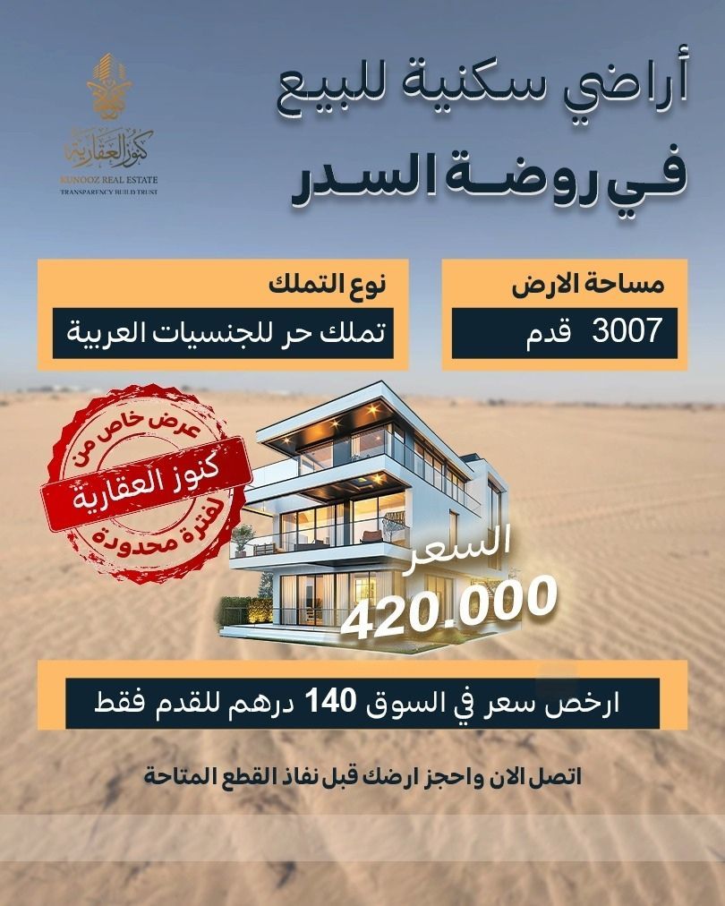 أراضي سكنية للبيع في روضة السدر - فرصة ذهبية المساحة 3007 قدم نوع التملك تملك حر للجنسيات العربية السعر 420000 درهم فقط (أرخص سعر في السوق - 140 درهم للقدم) العرض مقدم من كنوز العقارية - لفترة محدودة احجز أرضك الآن قبل نفاد القطع المتاحة