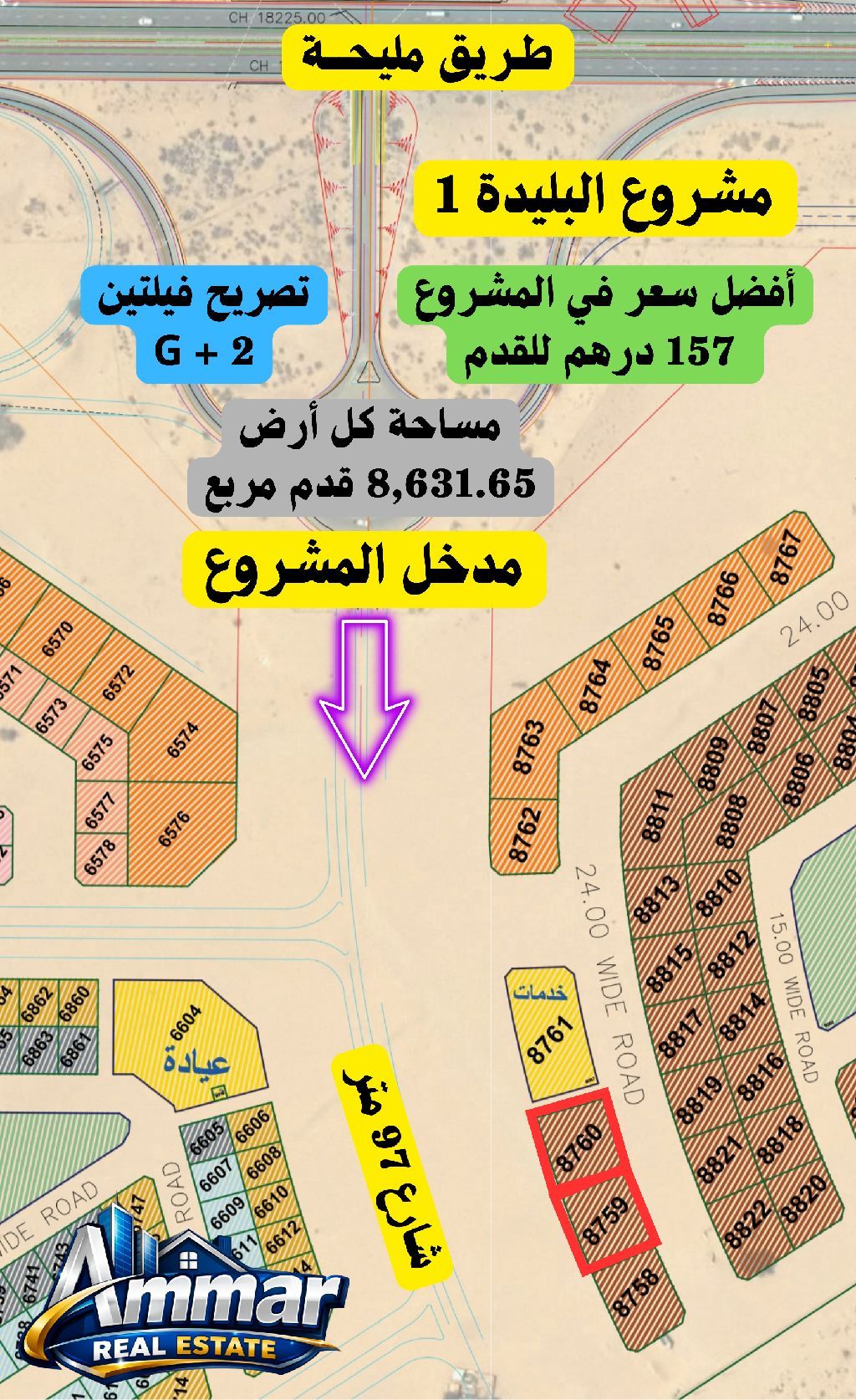 أرض للبيع في البليدة 1، في إمارة الشارقة، مساحة كل أرض 8631.65 قدم مربع، تملك حر لجميع الجنسيات، تصريح فيلتين متلاصقات أرضي + طابقين، موقع مميز على مدخل المشروع وعلى شارع رئيسي بعرض 97 متر مربع، بسعر مميز 157 درهم للقدم، لمزيد من التفاصيل يرجى التواصل