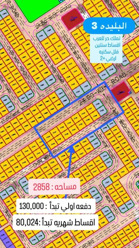 للبيع أرض سكنية في منطقة البليدة مساحة 2858 تصريح بناء فيلا أرضي وطابقين تملك حر للعرب سعر ممتاز جدا 450000 بدفعة أولى بقسيمة 130000 والباقي اقساط على سنتين