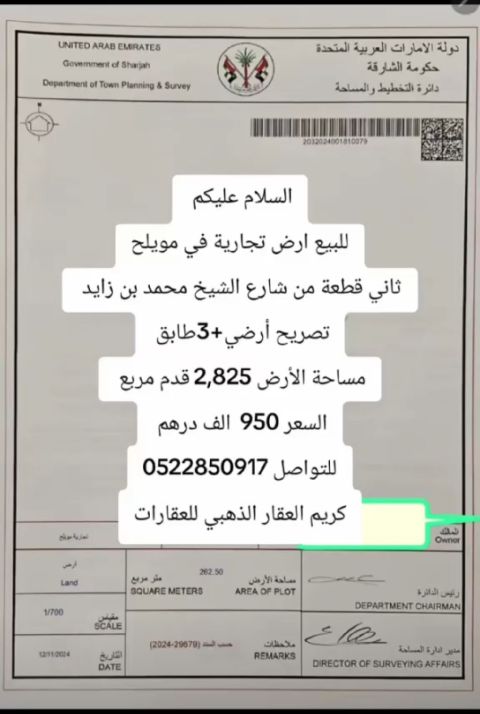للبيع أرض تجارية في مويلح ثاني قطعة من شارع الشيخ محمد بن زايد تصريح أرضي 3 طابق مساحة الأرض 2825 قدم مربع السعر 950 ألف درهم للتواصل والاستفسار