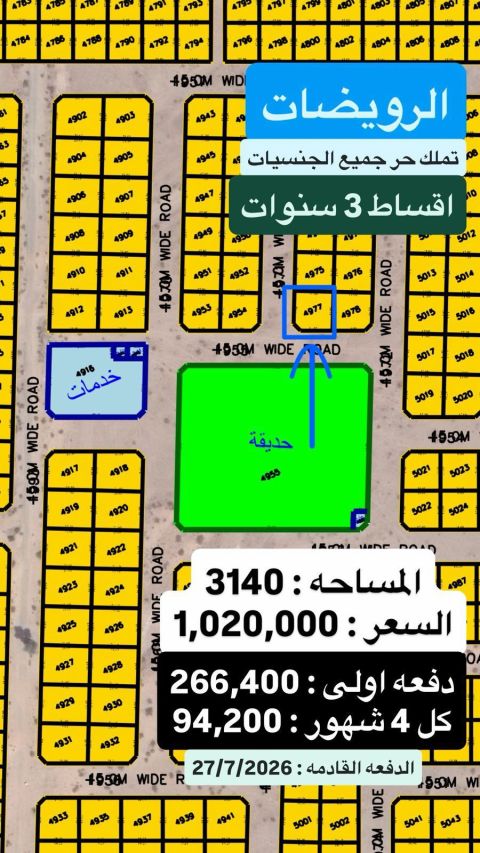أرض سكنية - الرويضات، الشارقة - 3140 قدم للبيع أرض سكنية بموقع مناسب في الرويضات - الشارقة التملك حر لجميع الجنسيات - نظام السداد اقساط لمدة 3 سنوات المساحة 3140 قدم السعر المطلوب 1020000 درهم طريقة الدفع دفعة أولى 266400 درهم - قسط كل 4 شهور 94200 درهم - الدفعة القادمة 27 / يوليو/ 2026