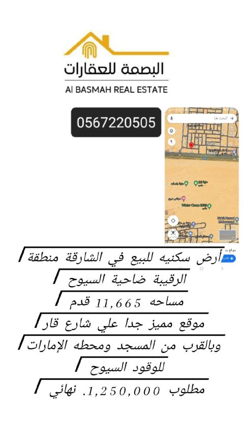 للبيع قطعة أرض سكني ب منطقة روضة القرط ضاحية الرويضات ب الشارقة مساحة الأرض 5166 قدم تصريح سكني أرضي وطابقين موقع استراتيجي مميز جدا ثاني قطعة من الزاوية قريب الحديقة والمسجد وقريب شارع خور فكان وشارع الامارات العابر وقريب منطقة السيوح تملك حر لجميع الجنسيات العربية مطلوب 690000 درهم