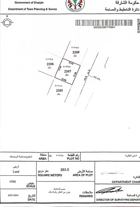للبيع أرض في إمارة الشارقة منطقة المطرق المساحة 2837 قدم مربع المطلوب 400 ألف موقع مميز