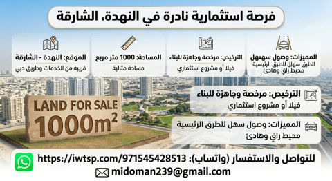 فرصة استثمارية ذهبية في قلب الشارقة أرض سكنية بموقع استراتيجي للبيع قطعة أرض مميزة في واحدة من أرقى مناطق الشارقة، توفر لك الخصوصية، الهدوء والربحية العالية. مواصفات الأرض المساحة 1000 متر مربع (مساحة مثالية) الموقع منطقة راقية جدا وقريبة من كافة الخدمات الحيوية. الحالة الأرض مرخصة بالكامل وجاهزة للبناء فورا. مميزات تجعلها خيارك الأول سهولة الوصول الى الطرق الرئيسية (مخرج ومدخل سهل) مثالية