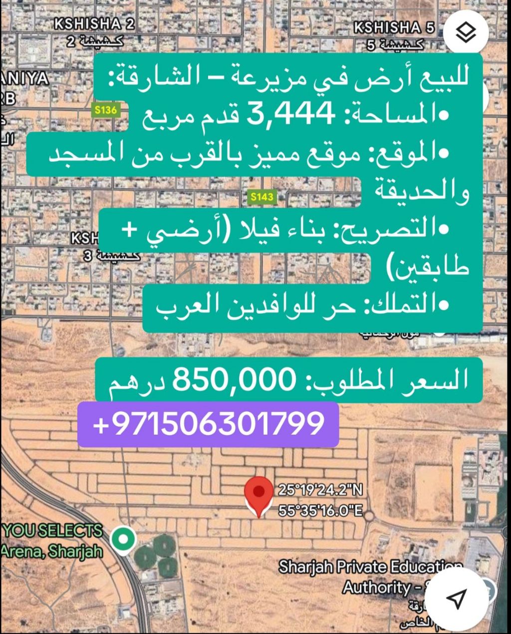أرض في مزيرعة - الشارقة المساحة 3444 قدم مربع - الموقع موقع مميز بالقرب من المسجد والحديقة - التصريح بناء فيلا (أرضي + طابقين) التملك حر للوافدين العرب السعر المطلوب 850000 درهم