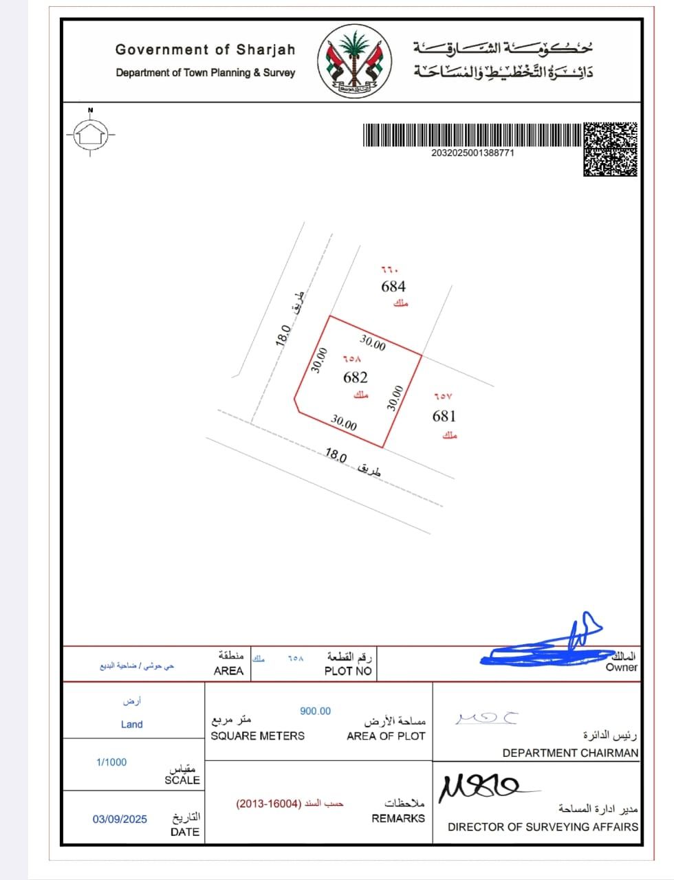 Prime land for sale in Sharjah - Freehold for Arabs Al Hooshi 1 area - Corner plot near the mosque Area 900 SQM (9690 SqFt) Frontage 30m x 30m Permit granted for building 2 residential villas or one large villa asking price AED1900000 Abu Mohammed
