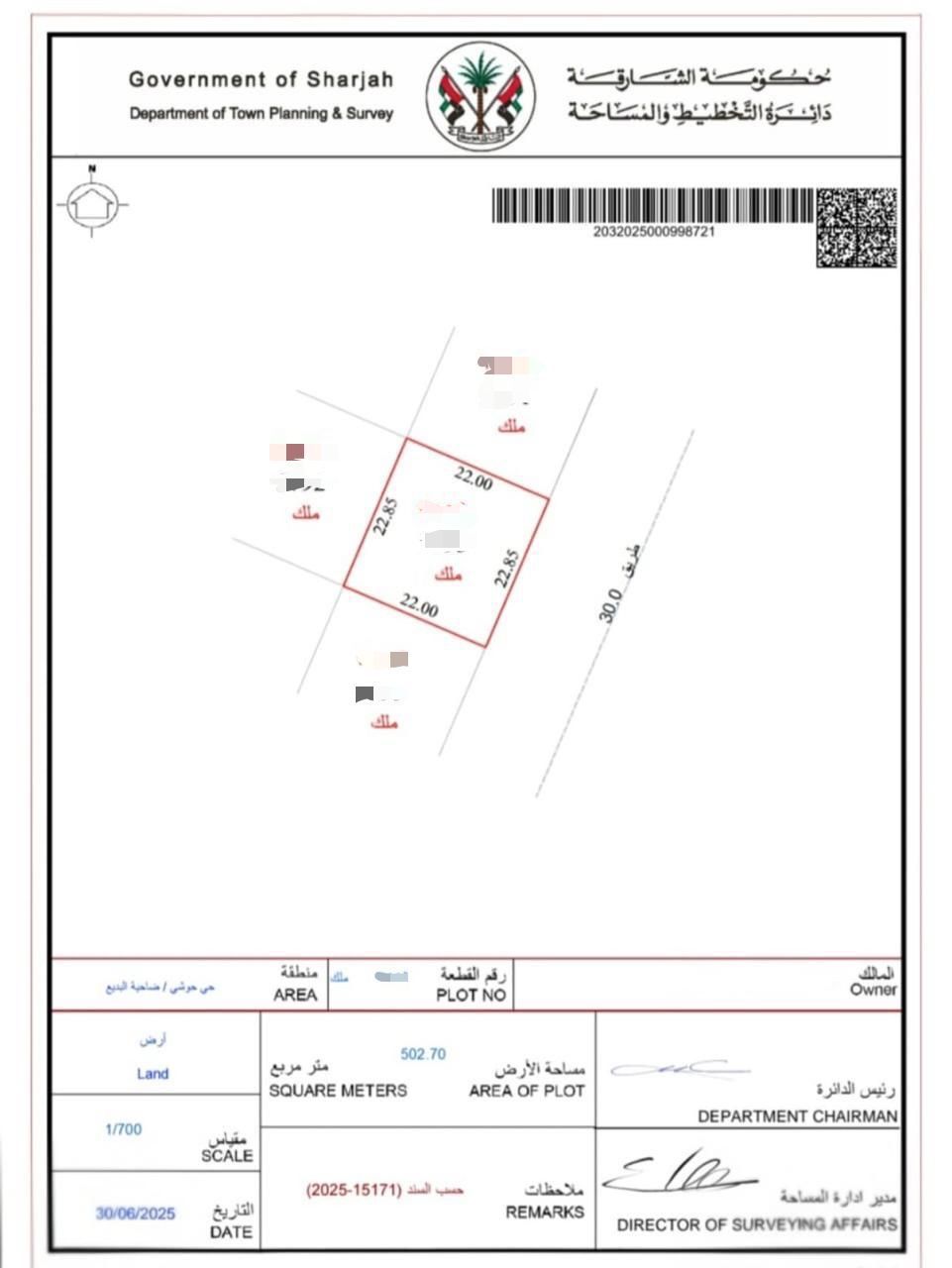 للبيع في منطقة الحوشي، الشارقة أرض سكنية مساحة 5418 قدم تصريح فيلا أرضي + أول + 50% رووف تملك حر جميع الجنسيات العربية السعر 1.3 مليون درهم مباشر من المالك للتواصل