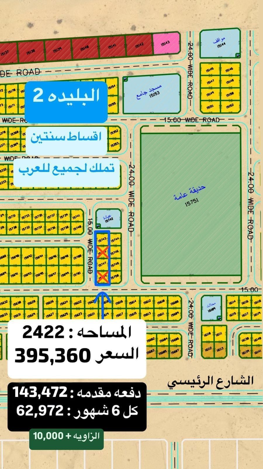 Residential Land - Blida 2 - 2422 ft for sale two residential plots of land in Blida 2 project in a privileged location. Area 2422 ft per plot Free ownership for all Arabs Total price per piece AED395360 Angle price AED405360 Payment plan Down payment AED143472 - 6 months installments AED62972 - Payment period 2 years