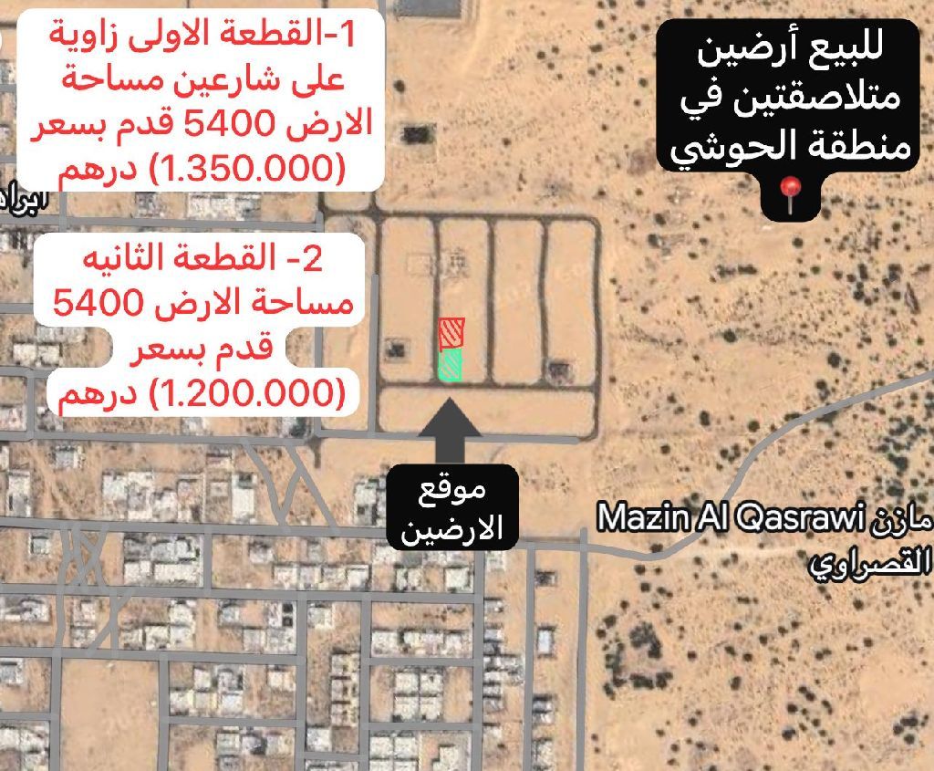 Two adjacent plots of land for sale in the Al - Hawshi area. The first plot is a corner plot on two streets, with a very distinctive location. Its area is 5400 square feet, priced at 1350000. The second plot is 5400 square feet, priced at 1200000. Ground floor and first floor, and 50% roof space