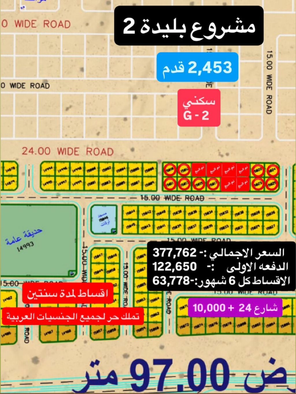 For sale - Residential Land - Blida 2 Project - Sharjah Area 2453 ft Building Authorisation Residential G 2 Total price AED377762 Down Payment AED122650 Payment system installments every 6 months worth AED63778 - for two years Location On 24th Street + additional parking AED10000 Ownership free for all Arab nationalities
