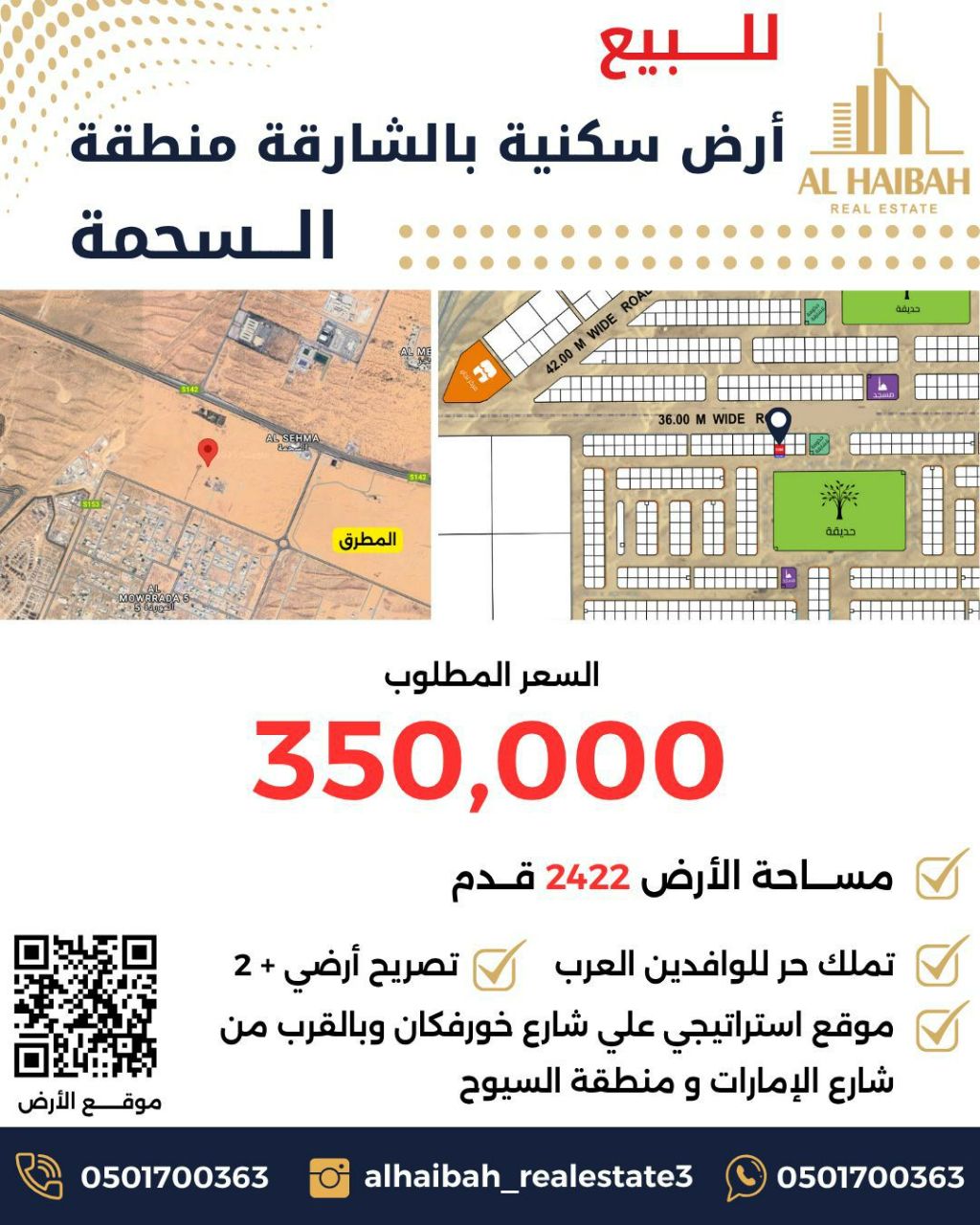 للبيع أراضي سكنيه في الشارقة منطقة السمحة تملك حر لجميع الجنسيات العربية، موقع استراتيجي على شارع خور فكان وبالقرب من شارع الامارات ومقابل منطقة السيوح السكنية في الشارقة مساحات الأراضي تبدأ من 2422 قدم للأراضي السكنية يسمح ببناء أرضي وطابقين أسعار تبدأ من 380000 درهم لا تتردد بالاتصال
