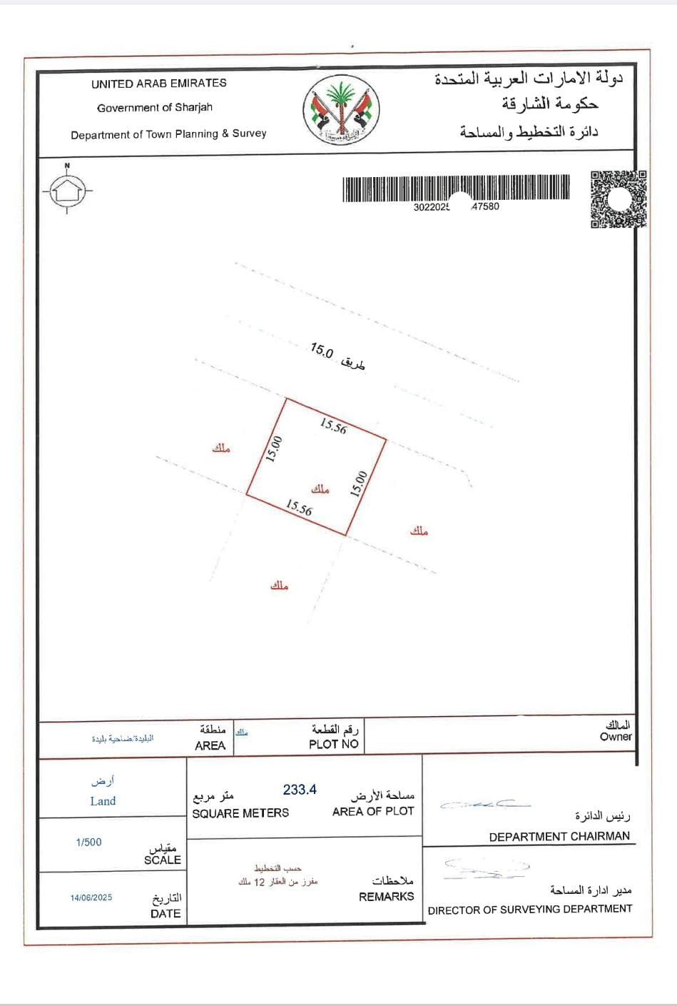 للبيع أرض سكني استثماري في الشارقة منطقة البليدة 2 مساحة الأرض 2500 موقع متميز جدا قريب جدا من مدخل ومخرج الشارقة قريب من الحديقة والخدمات البيع عن طريق الاقساط دفعه أولى والمتبقي على 4 دفعات كل 6 شهور حتى 2027 سعر القدم 155 درهم تملك حر لجميع الجنسيات العربية
