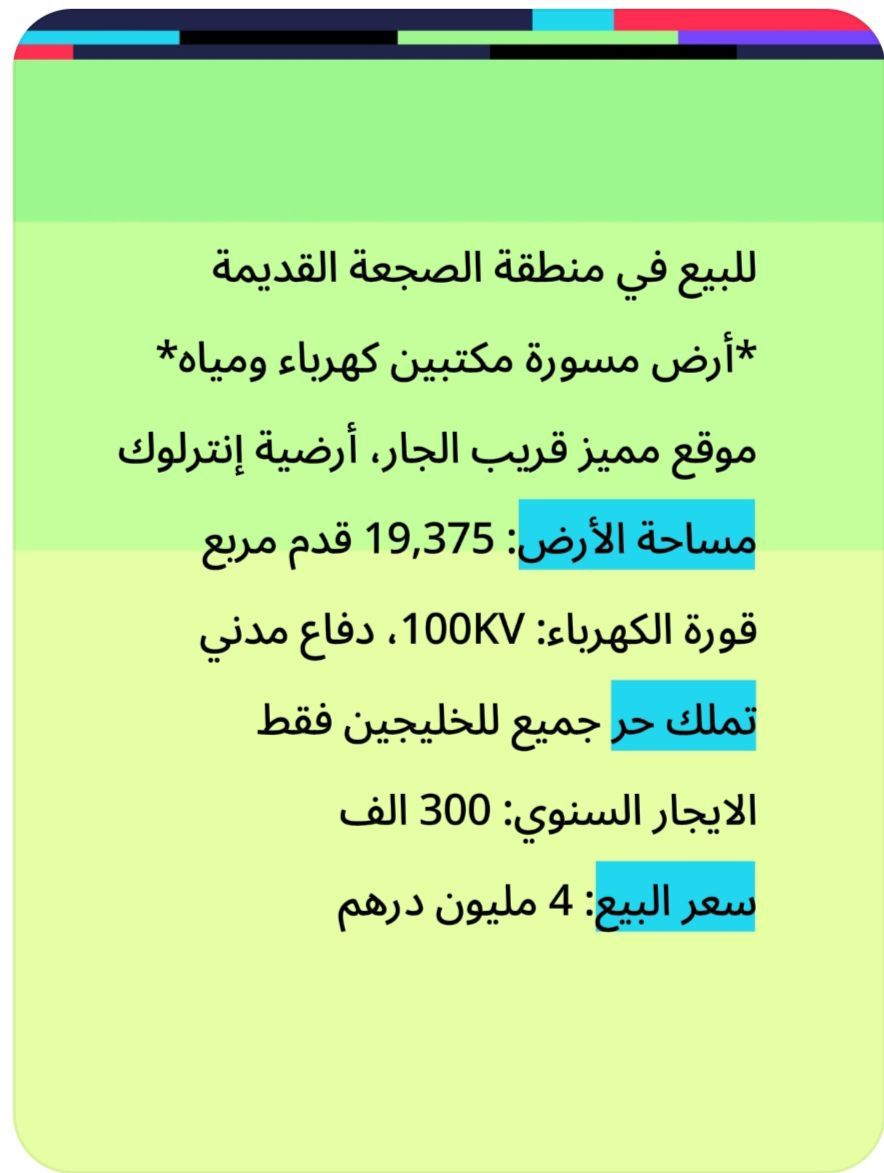 للبيع في منطقة الصجعة القديمة أرض مسورة مكتبين كهرباء ومياه موقع مميز قريب الجار، أرضية انترلوك مساحة الأرض 19375 قدم مربع قورة الكهرباء 100 KV، دفاع مدني تملك حر جميع للخليجين فقط الإيجار السنوي 300 ألف سعر البيع 4 مليون درهم