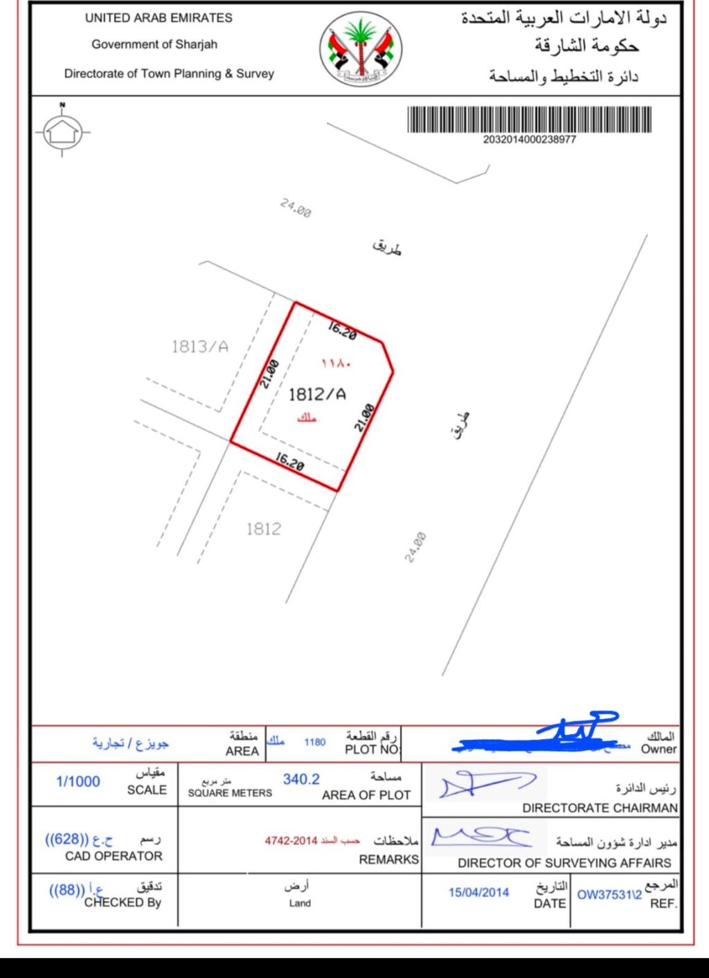 Commercial Corner Land for sale in Sharjah - Al Ruwaidhat Al Malha (currently) Corner plot on 24 streets, 21m frontage x 16m x 21m Area 340 SQM (3660 SqFt) Permit for ground floor and 4 floors. asking price AED650000 Abu Mohammed