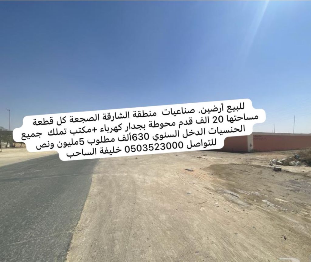 للبيع أرضين. صناعيات منطقة الشارقة الصجعة كل قطعة مساحتها 20 ألف قدم محوطة بجدار كهرباء + مكتب تملك جميع الحنسيات الدخل السنوي 630 ألف مطلوب 5 مليون ونصف للتواصل خليفة الساحب