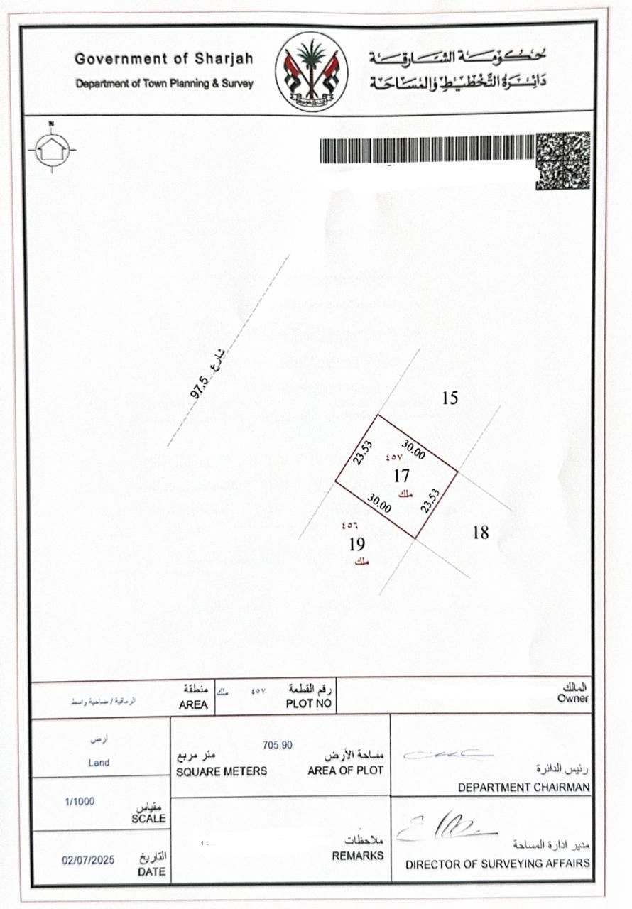 للبيع أرض في الرماية - الشارقة المساحة 7598 قدم مربع الموقع مميز على شارع رئيسي السعر المطلوب 1250000 درهم