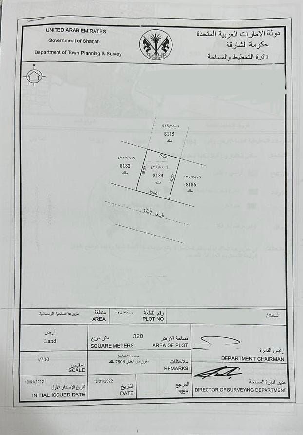 Residential Land in Mazirea - Sharjah Area 3444 feet Total price 700000 dirhams A privileged location within the Muzira area, suitable for building a private residential villa, characterised by easy access and proximity to vital services and facilities