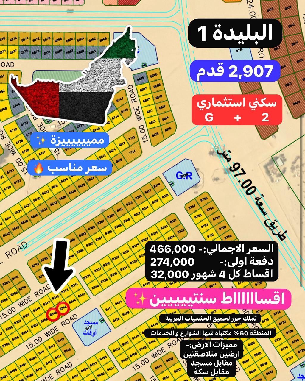 For sale - Two adjacent residential plots located in Al Blida 1, directly opposite the mosque. Prime location in a well - developed residential area close to all essential services and main roads. Property Details Location Al Blida 1 - Opposite the mosque Type Residential land Price per plot AED466000 Down Payment AED274000 Installment AED32000 every 4 months Both plots are ideal for residential